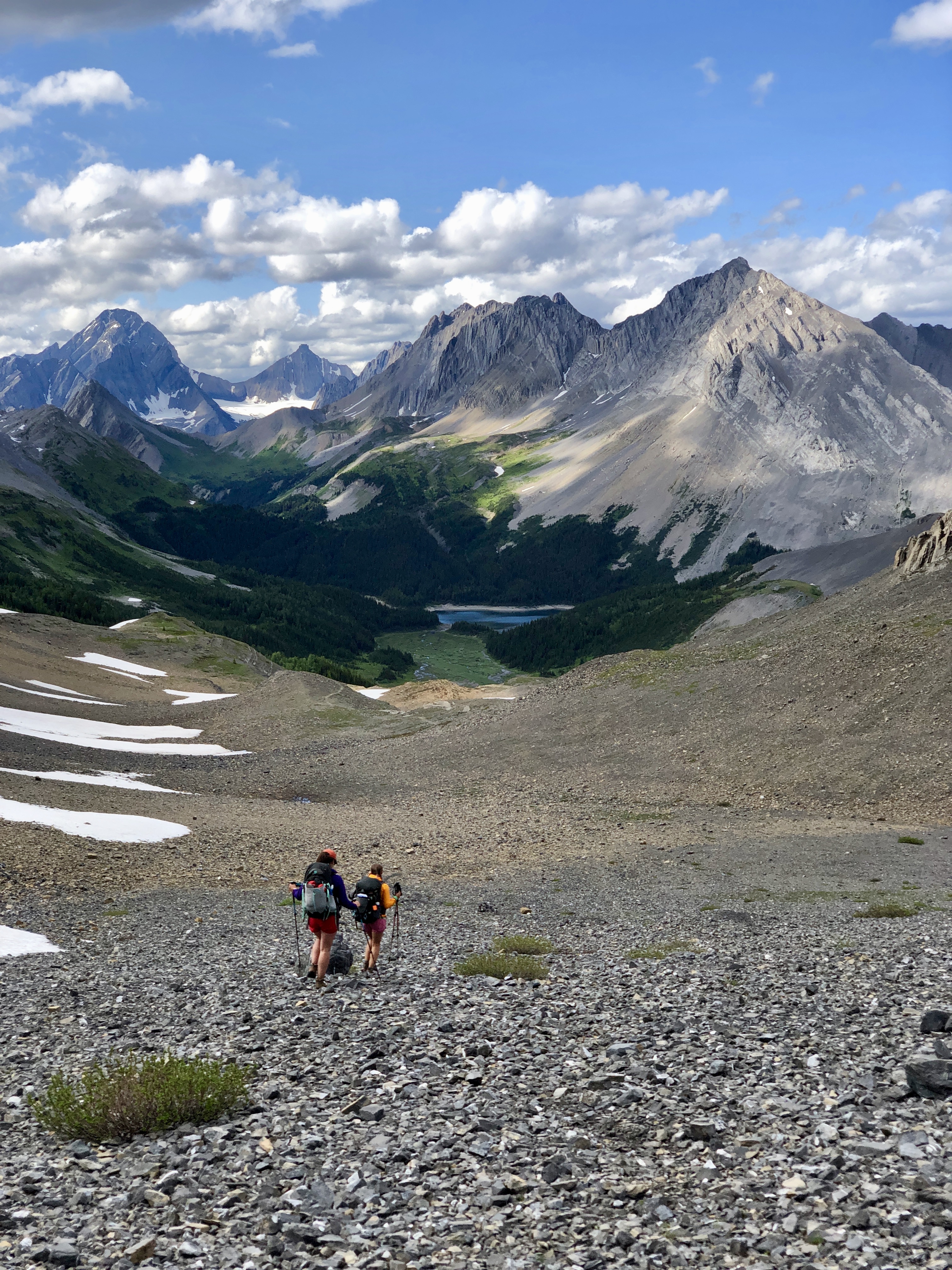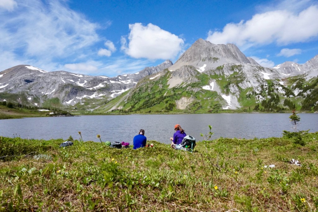 Once you get to Hidden Lake, you can either walk along the lake or take the trail in the woods (depending on the water level). The water was fairly high for us, so we continued on the trail in the forest to the back of the lake. From the back of Hidden Lake, the trail goes UP! You will start to gain a lot of elevation. Once you’re out of the trees, the trail takes you through rock and scree. You will want good boots and poles for this, especially with your heavy pack. We did not find the trail hard to follow and it was marked with cairns through the rocky sections. When you pause to catch your breath (because you’ll need to), make sure to look back! The view of the Upper Kananaskis Lake is amazing from this point. From here on out, there are endless amazing views to enjoy. You’ll see waterfalls and lots of wildflowers (depending on the time of year) as you make your way towards Aster Lake.