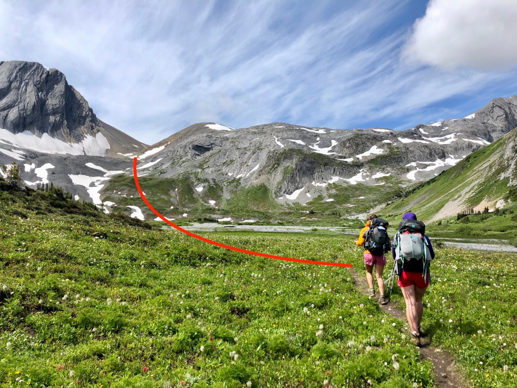 From the campground, the trail will take you all the way around Aster Lake. At the back of the lake, you will walk through gorgeous alpine meadows and eventually you will be back in the scree as you make your way up. From the lake, follow the trail straight along the creek bed! You will be heading towards a grassy slope that is nearly straight across from Aster Lake. Do not branch off on other marked trails to your left or right. We had read about other parties doing so, and it cost them a lot of time. Keep following your map and head towards Mount Northover. We made sure not to make this mistake, so a big thank you to their blog post for giving us the heads up. Reference your map or GPS if you are worried. You will be heading in the direction of the red line on the photo below.