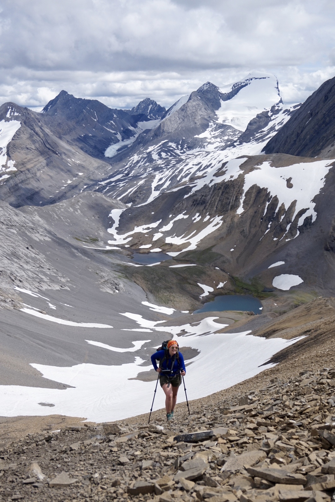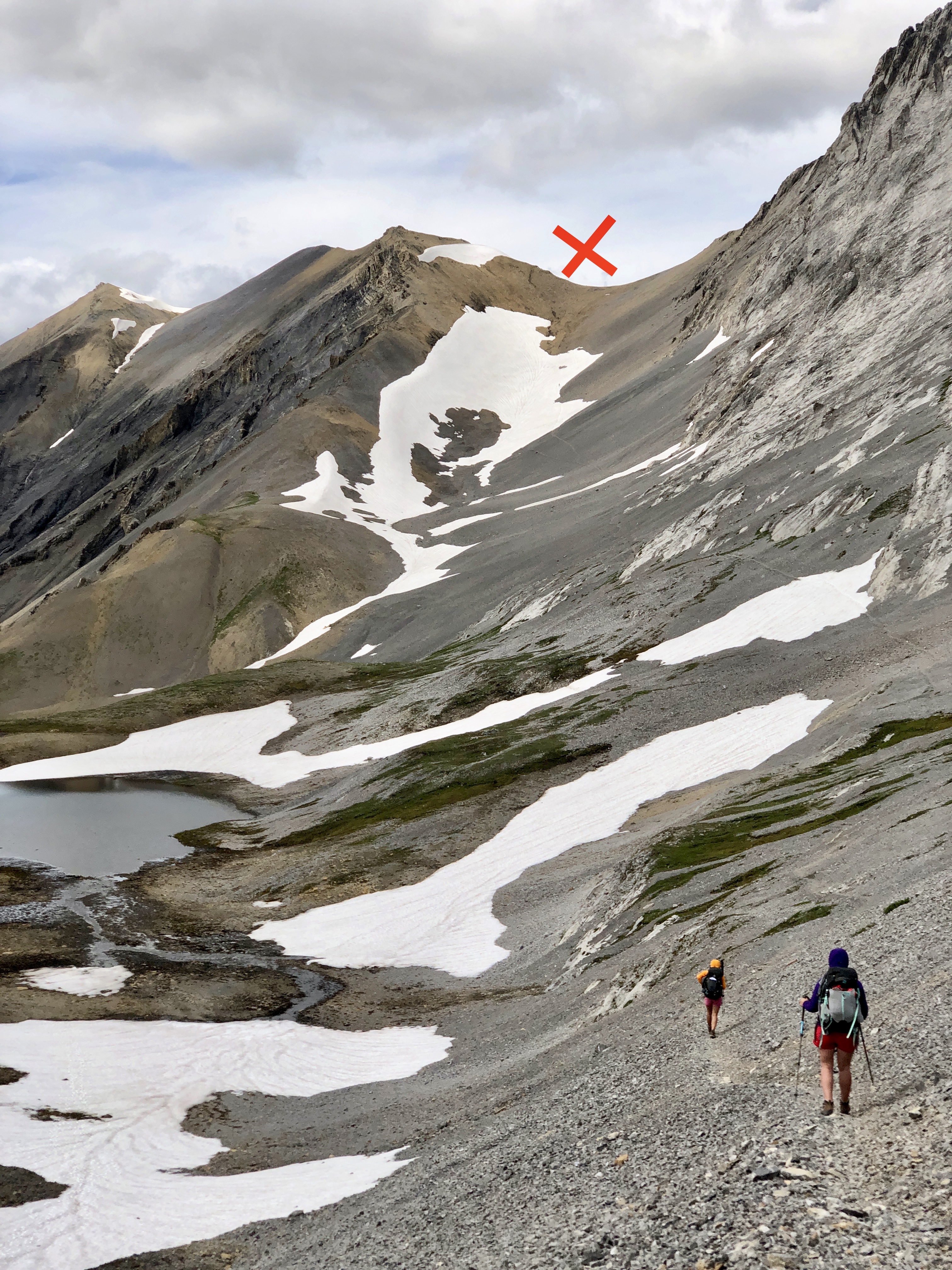 Once you hike up the grassy slope, you will find yourself continuing up higher back into scree. There are many cairns marking the way and the trail is easy to see. Eventually, the trail will take you to the right, behind Mount Northover. Throughout this next section, you are hiking right along the Alberta/BC Border which is pretty neat! As you continue on, you will see some tarns down below to your left. Those are in BC (and people actually use this as a camping spot as well). Enjoy the views as they just get more incredible as you keep following the trail up. Eventually, you will come to a steep scree slope that you need to hike up in order to gain the ridge. When we hit this section there was a fair bit of snow still, but luckily the previous steps people had put in were easy for us to follow. The red “x” in the photo below is where you need to head to gain the ridge.