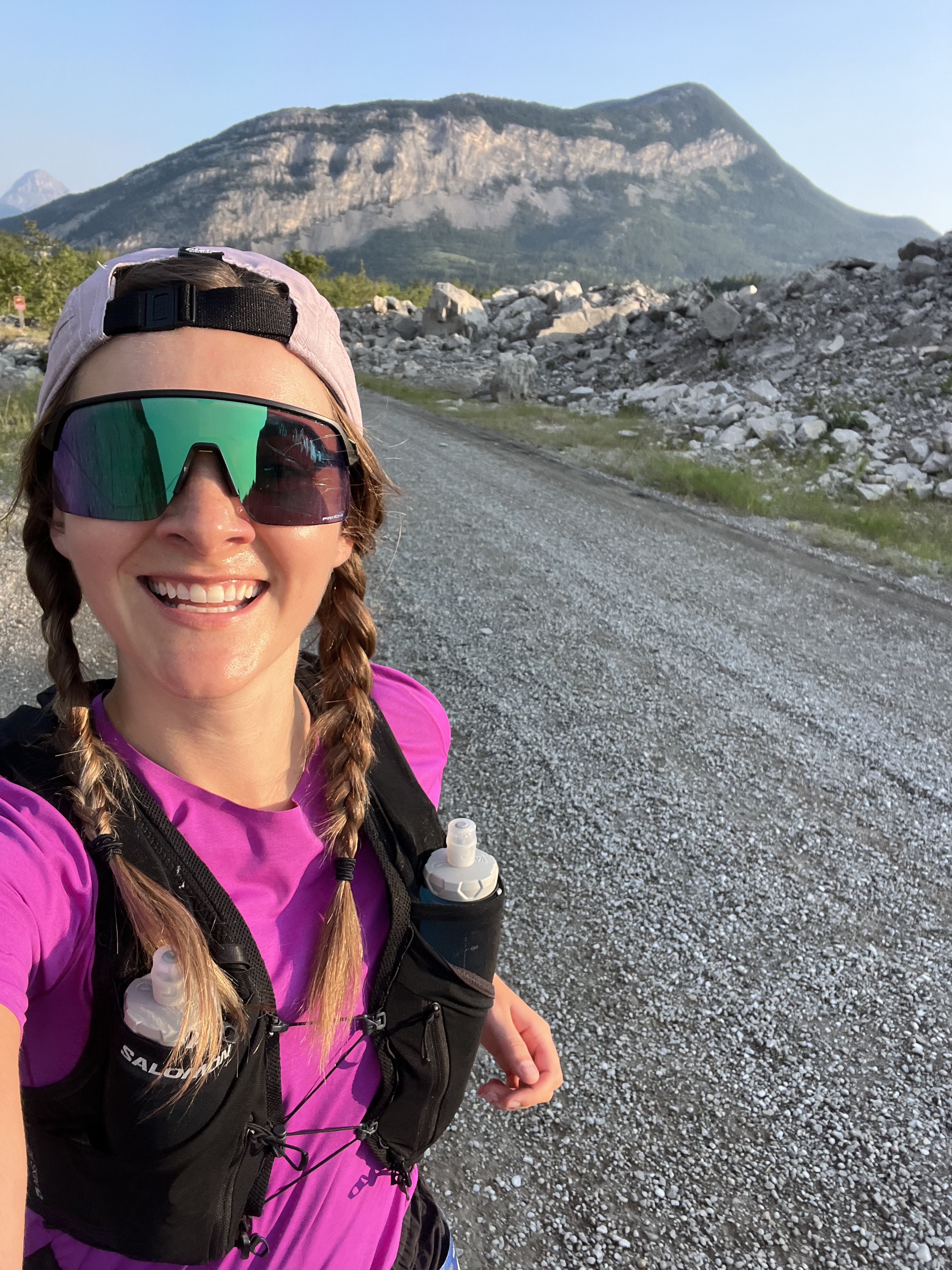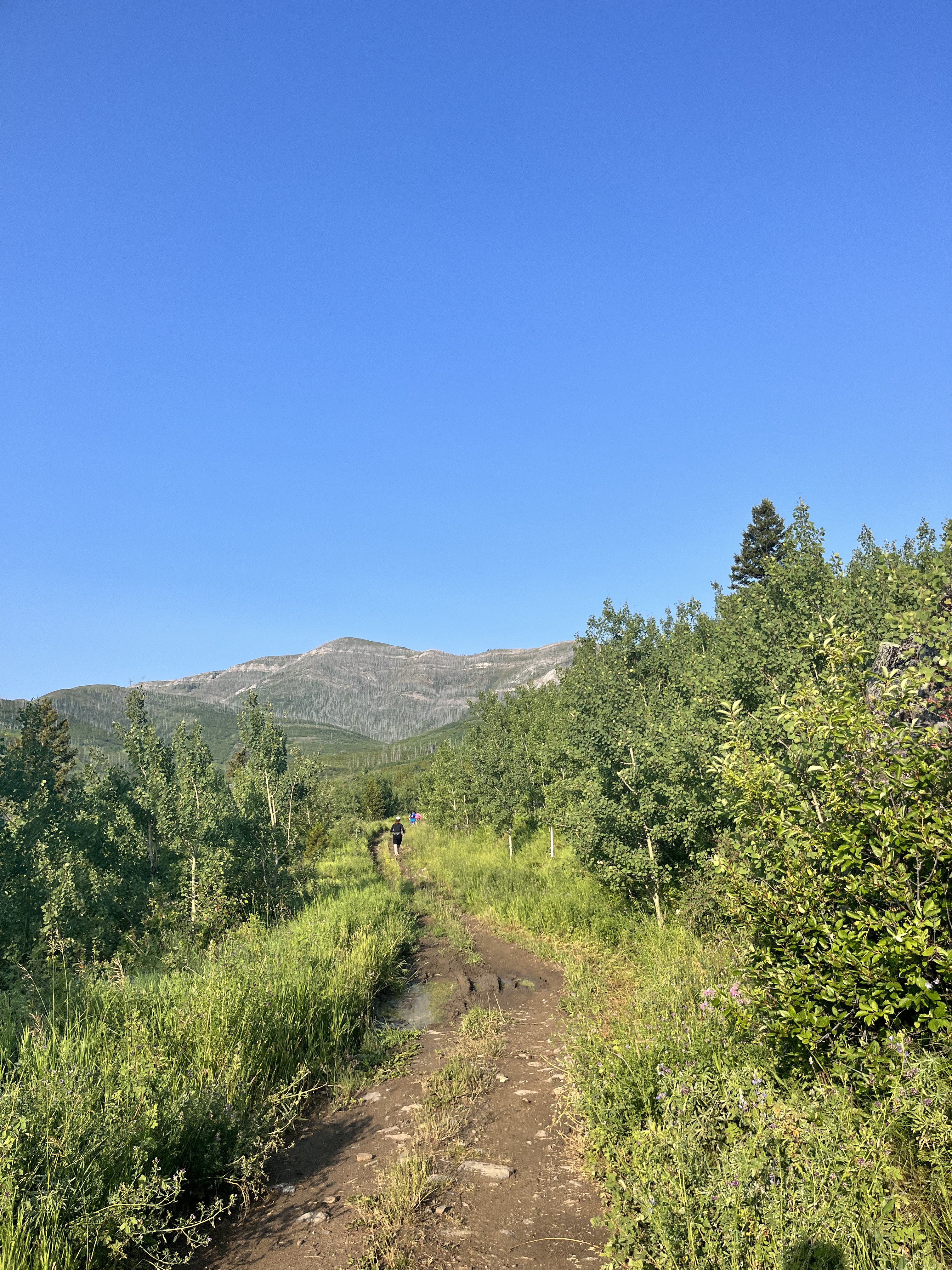 Start line energy always gets me excited, and admittedly a little emotional. It’s just so awesome to see so many people out there going after their goals. Nichole and Sam came to watch us start, and it wasn’t long until everyone was counting down and cheering. I was off, and the start of the race was slightly chaotic. There were a lot of runners, and within 1km or so it switched from a big open road to a small trail in the ditch beside the highway. The options were to run a little too fast and pass people when possible, or hang back and run a little slower in the long line of runners. I opted to run a little faster than I would have liked, but I wanted to get out of the crowd. After a while, we got off the narrow trail and were back on a dirt road running through Frank slide. It was very neat to run through this area and I soaked in the moment.