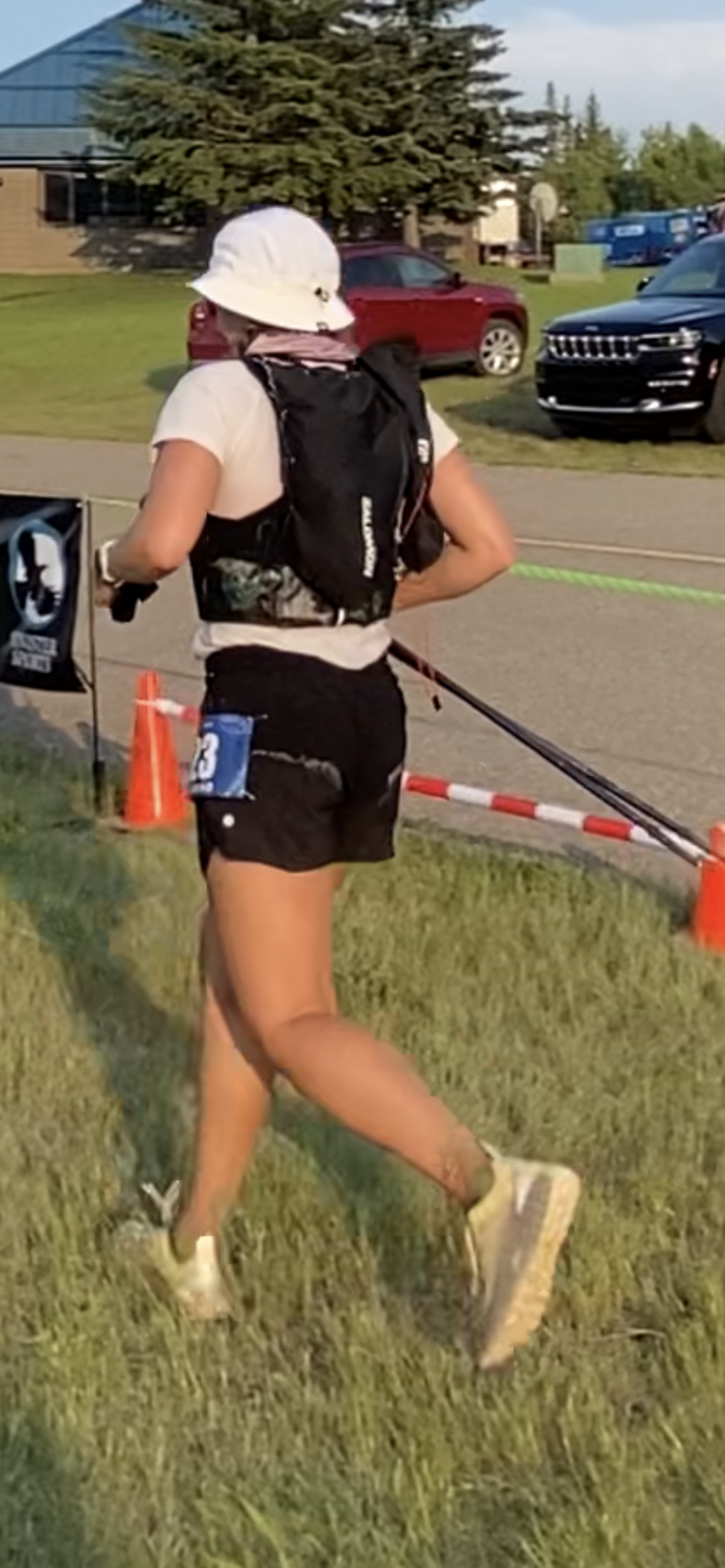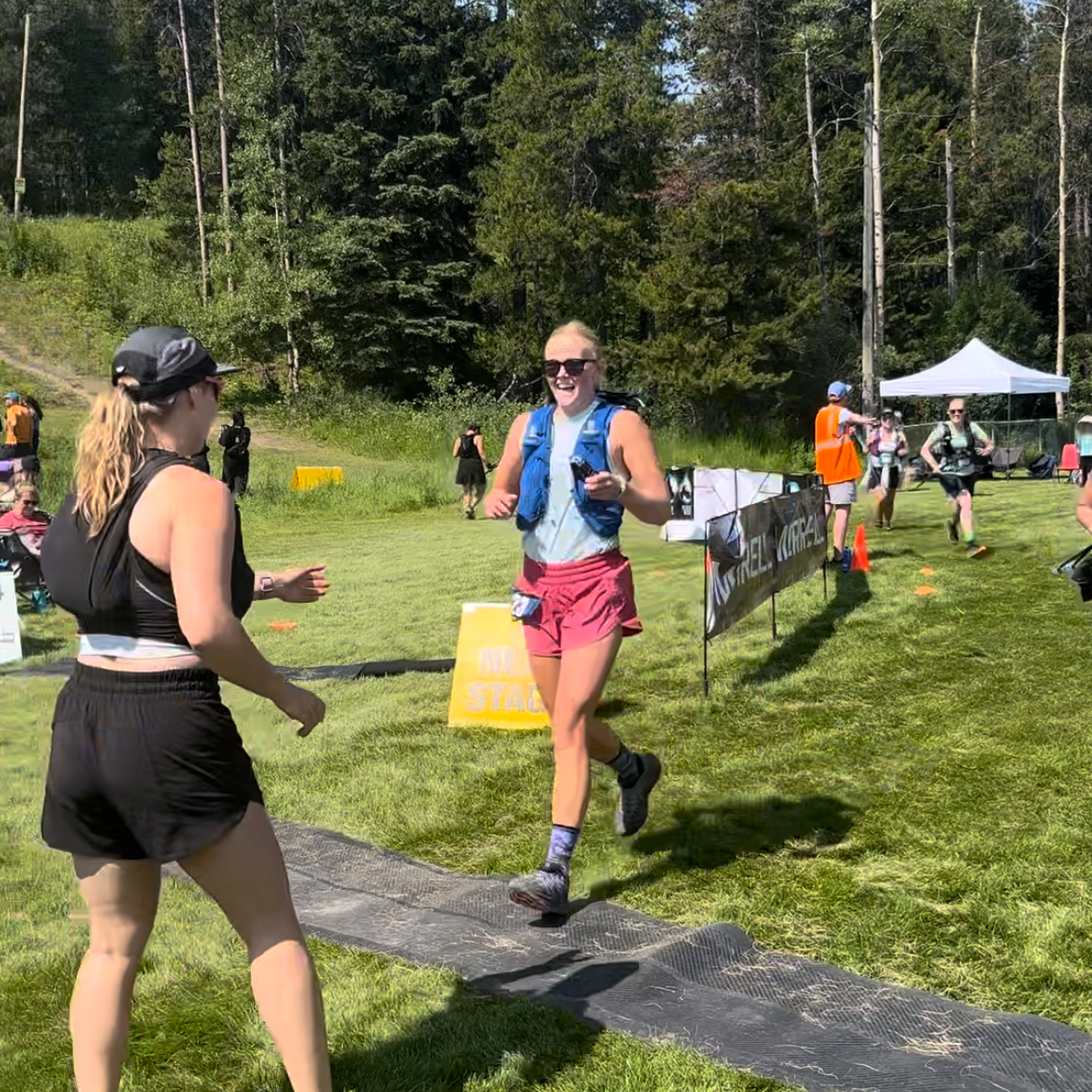 After climbing for a while I finally started to descend and eventually found myself on the section of this leg that I ran during the 50 miler a few years back. This next section seemed to drag on. I was feeling tired and mentally at a low. I played a game with myself where I would pick a tree, run to it, then let myself walk for a short section. I also put on a big booty mix to try to pump myself up. I kept doing this until I got to the final few km’s of the leg where it was all downhill. I decided at that moment that I was going to leave it all out on this course and finish with a bang. I picked up my pace from a 7:00-8:00 min/km to a 5:26 min/km and just ran to the end until I wasn’t even sure what my legs were doing anymore. I came into the aid station, tagged out Nikki again, and hit the ground covered in salt and with nothing left in the tank. My parts of the relay were now done, and it was time to focus my energy onto supporting the girls through the rest of it.