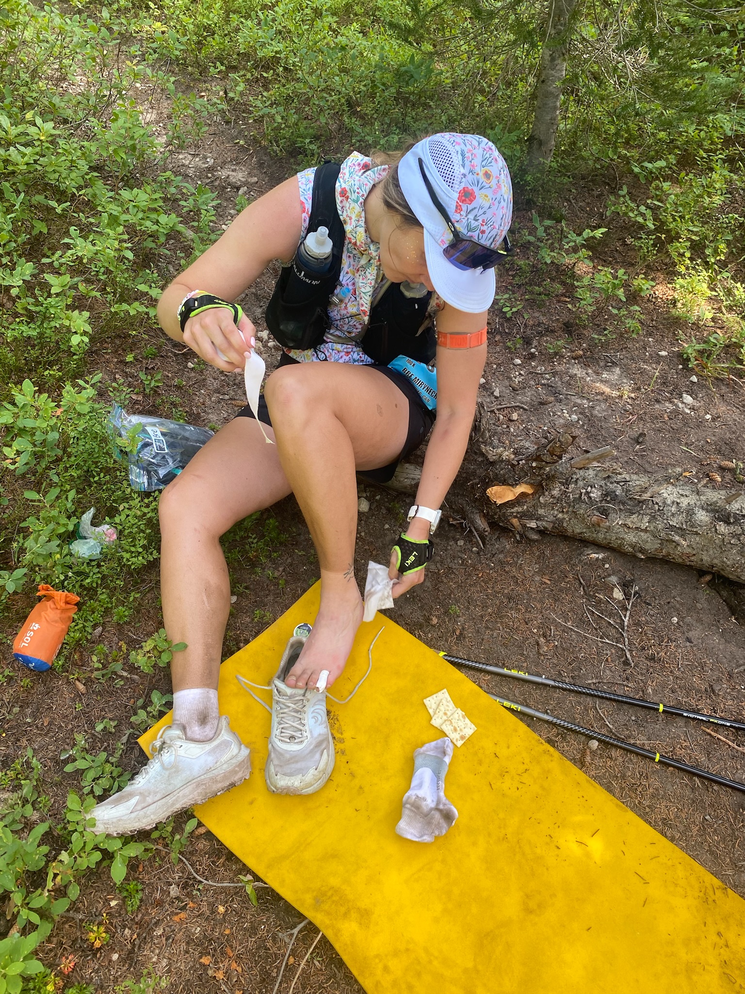 Ok, so now that I am beautifully reminded that this is the whole point, I am not living in a world of shoulds anymore, I am being kind to myself, I’ve given Rachel an incredibly heartfelt (and loud) rendition of Defying Gravity from Wicked- this day has completely turned around! We are running, we are grooving, we are yapping, we are laughing, and we are being so kind to ourselves. I don’t think I can adequately express in words just how much this time out there with Rachel meant to me. It was so raw, so vulnerable, so emotional, so beautiful, and it’s a time that I will hold close to my heart forever. As we got to the Nicomen Lake aid station (or this may have happened before all of the life lessons- I can’t remember) I mentioned to Rachel that I was feeling some rubbing on my feet. I didn’t want to stop to deal with them because I didn’t want to take the time to stop, but Rachel graciously told me to take the time to deal with my feet. So we did (because remember- we are being kind to ourselves!)