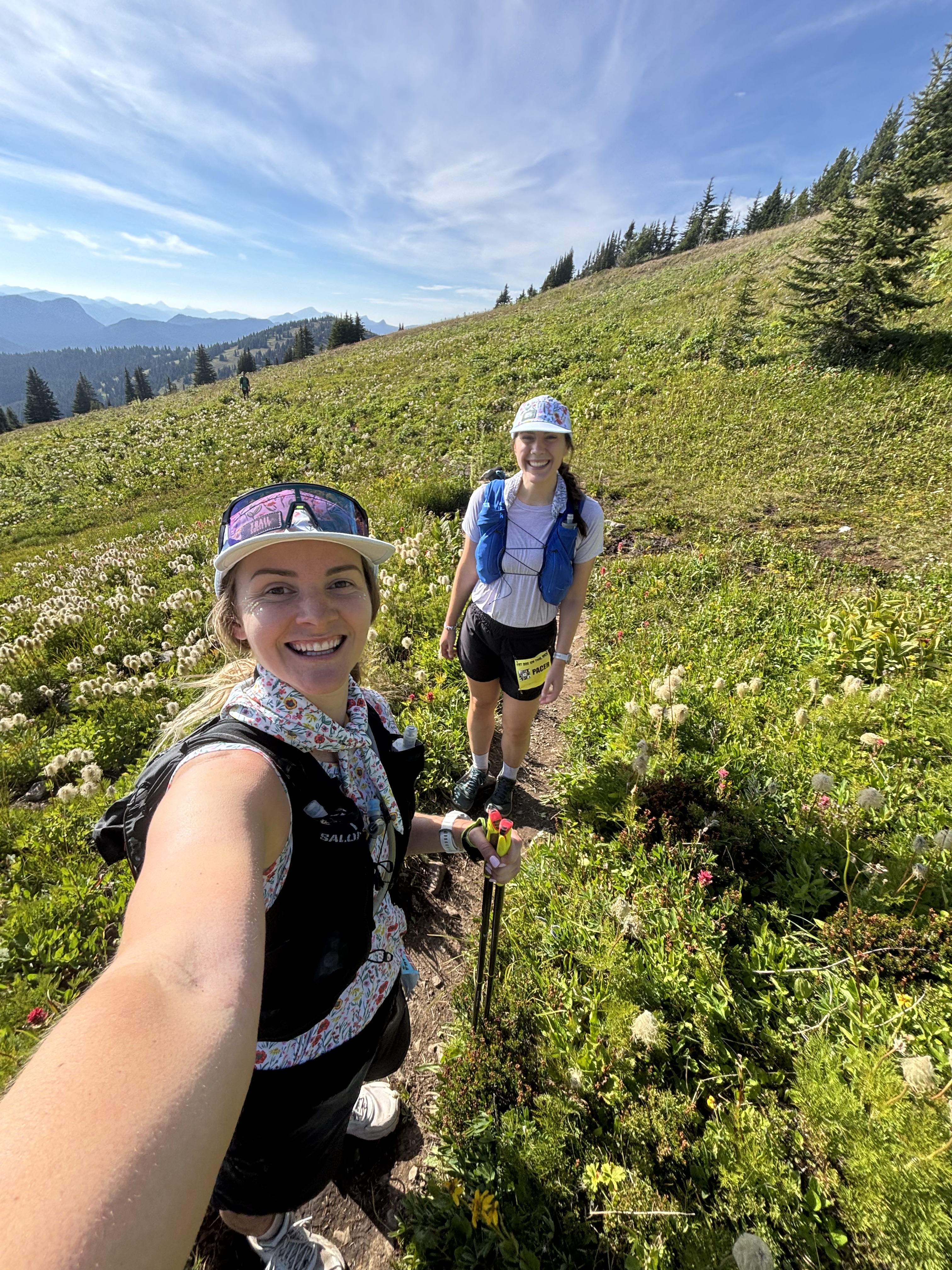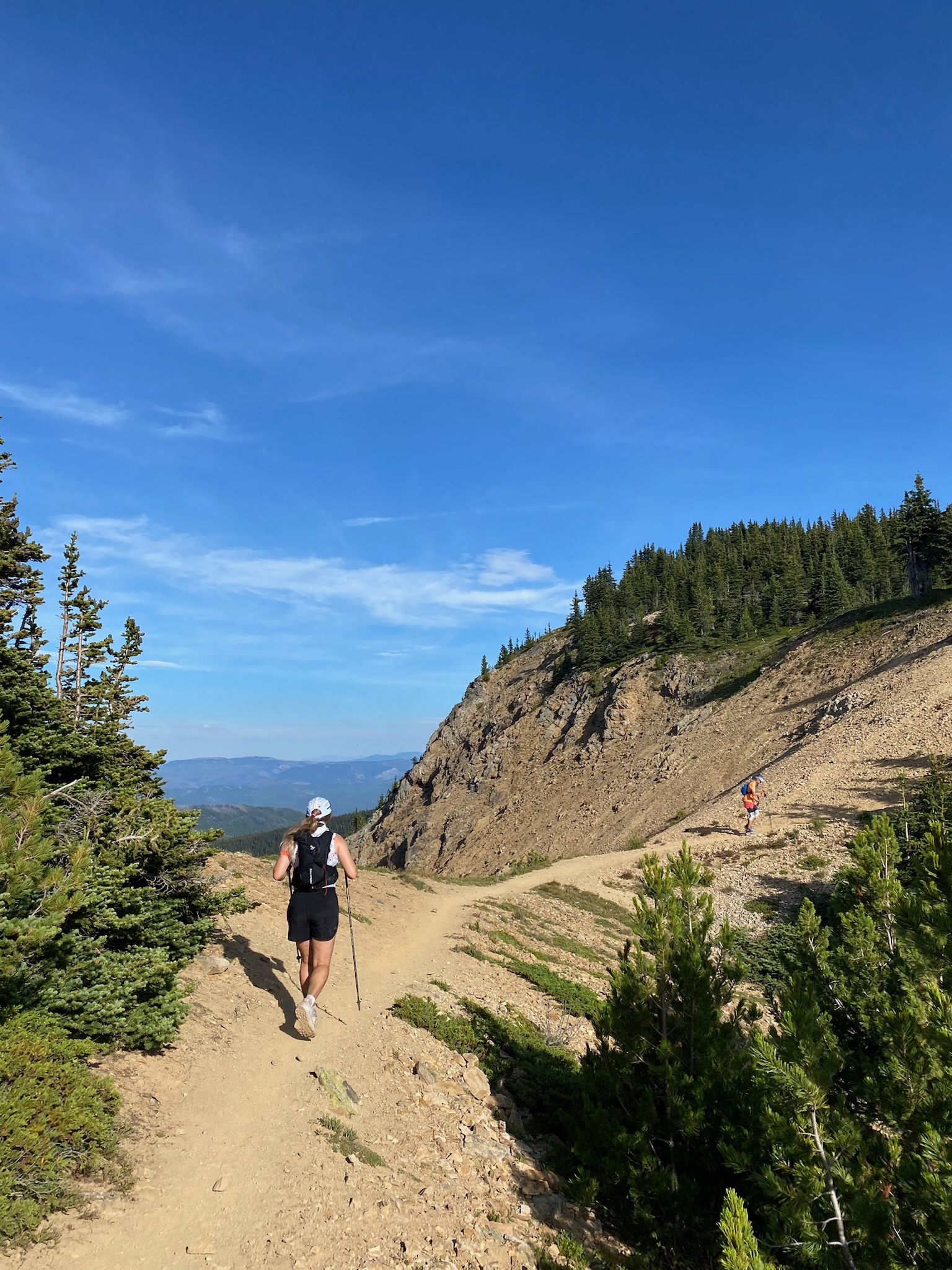 The trail climbs out from Nicomen Lake and this is where the views really start popping off! We hit the halfway point after the climb, and we continued to enjoy every second of the beautiful trail. The wildflowers and views were amazing, and this entire section of the trail was just incredible. We got to the Heather aid station (56km ish) and we stopped again to deal with some more spots on my feet, and Rachel taped up some gnarly chafing that had started popping up along my waist. I ate some more solid food (!!!!) and we started making our way toward Blackwall aid station. The original plan was that I’d leave Rachel at Blackwall and continue on my own for a while before picking up Mack for the last section, but at some point Racel asked if she could continue on with me until I picked up Mack as she was having so much fun. To this day, I wonder if maybe she picked up on just how much I needed her out there, but either way- the answer was an easy yes. Again, how amazing is she!? Get yourself a friend who will willingly run 60km of your 100km race with you. Rachel, if you are reading this, I owe you big time!