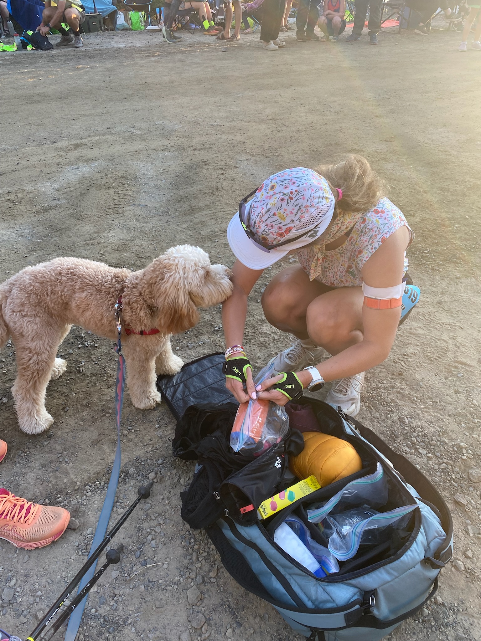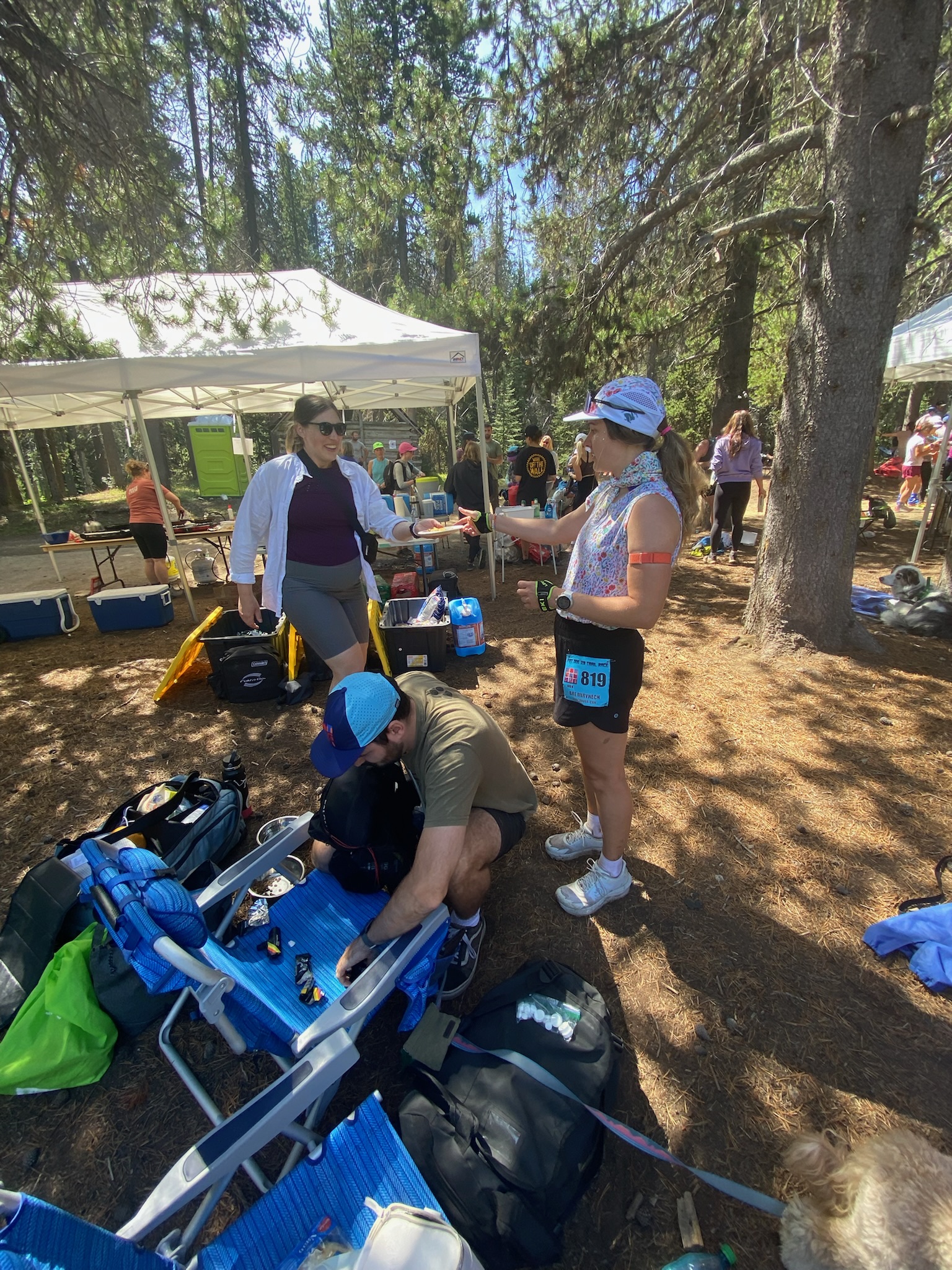 As we continued on the fatigue definitely started to hit me, but Mack’s encouragement (combined with some caffeine gels) kept me going. Skyline has a few false summits, and at one point we were sure there was one more to go, but to our surprise that was it! We started our descent back to the lake and the finish line. The plan was that we would run down from Skyline to the lake, but my feet were in such bad shape they couldn’t handle the downhill running, so we just continued hiking down. After a lot of protest from me and kindness from Mack, we stopped one last time on the way down to tape my feet yet again (read: me laying down on the trail sticking up a foot in the air for Mack to tape). If there is one thing I felt on this section, it was love. Having your partner show up for you in this way, support you, encourage you, and love on you when you are just so deep into such a wildly hard experience, well it’s incredibly special and beautiful and there are no words. I felt so loved, and in turn I felt so strong and knew I could finish this thing. Eventually we hit the trail along the lake, so I knew we were close. My feet were pretty excruciating at this point, but as soon as I saw the bend in the trail at the end of the lake I took off sprinting (or at least it felt like it). I think I confused Mack with my sudden energy and all I remember was starting to cry (both tears of joy and fatigue) and saying “I am going to actually do this”, and charged through that finish line. My friends were there, Mack was back by my side, Ellie (my dog) was running around, and I remember hugging the race director and simultaneously thanking him for such a great event while crying at how hard it was.