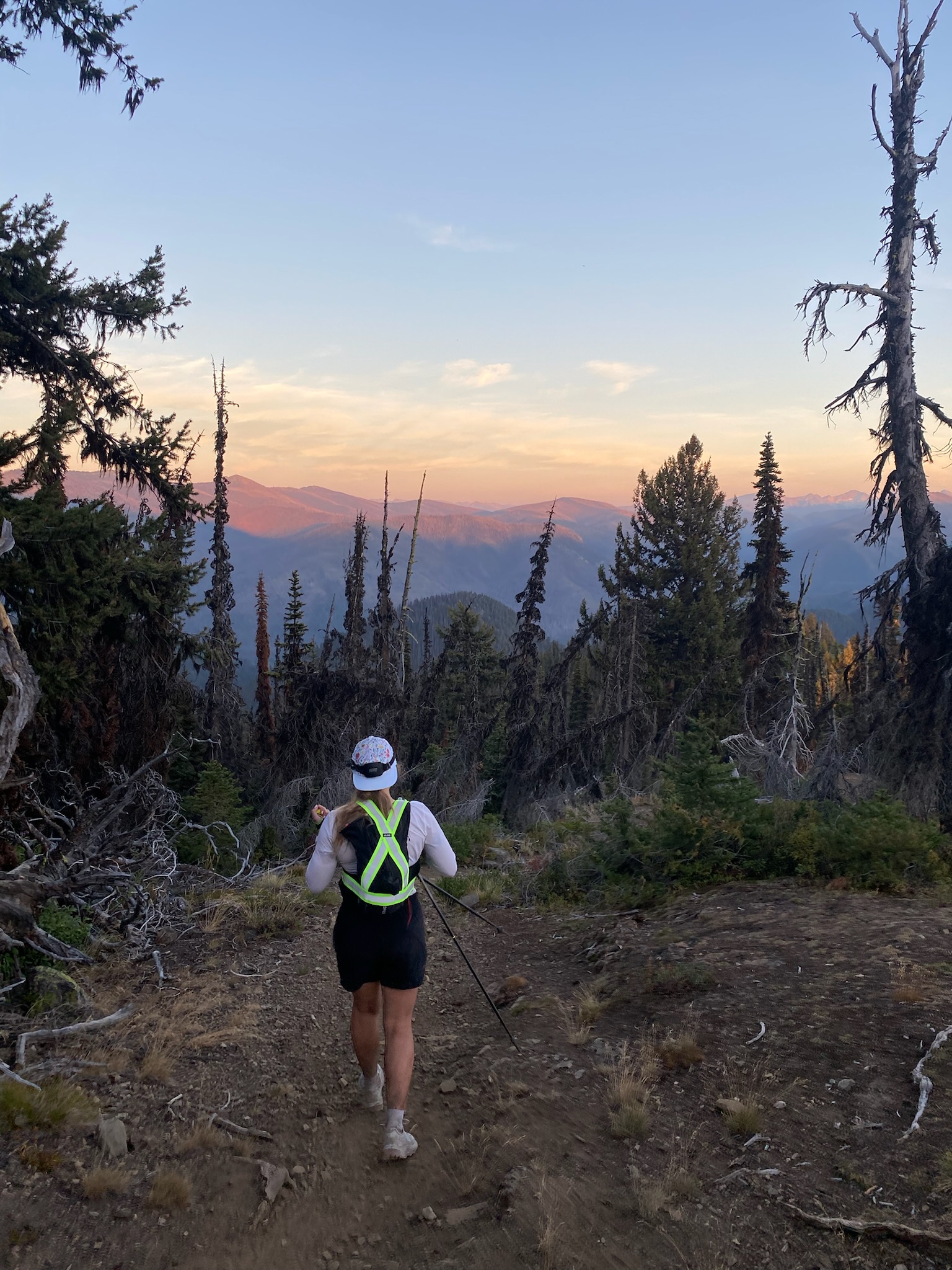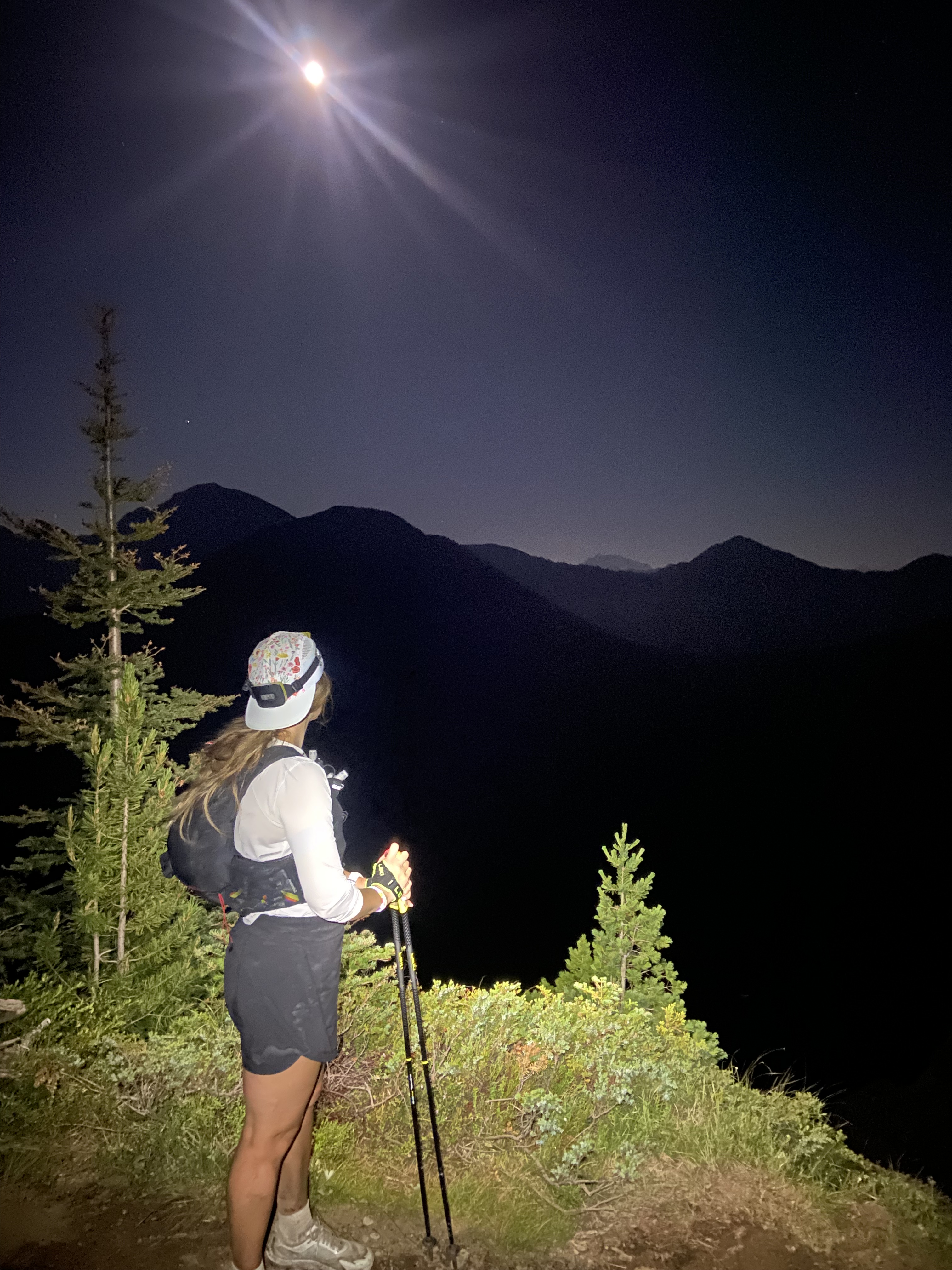At Strawberry Flats, Rachel’s journey ended, Mack was getting ready to pace me for the final section, and Danielle was making sure I was geared up and ready to go through the night- and that included a friendly reminder from her to brush my teeth. A huge shoutout here to Danielle who came out to crew me for this race while being very pregnant, and took the absolute best care of me out there. If you’ve run an ultra, you know the impact your crew has and Danielle made sure I was loved and cared for all day long. I left Strawberry Flats so excited for the last section, as I have never had Mack join me as a pacer before! I couldn’t wait to share this section with him through the night. We started the slow and steady climb up Skyline, I told him all about my day, we chatted about how much he loved the experience of crewing all day and how amazing Fat Dog is as an event, and we just keep making slow and steady progress to the top. It was a full moon that night and it lit up the surrounding mountains so beautifully.