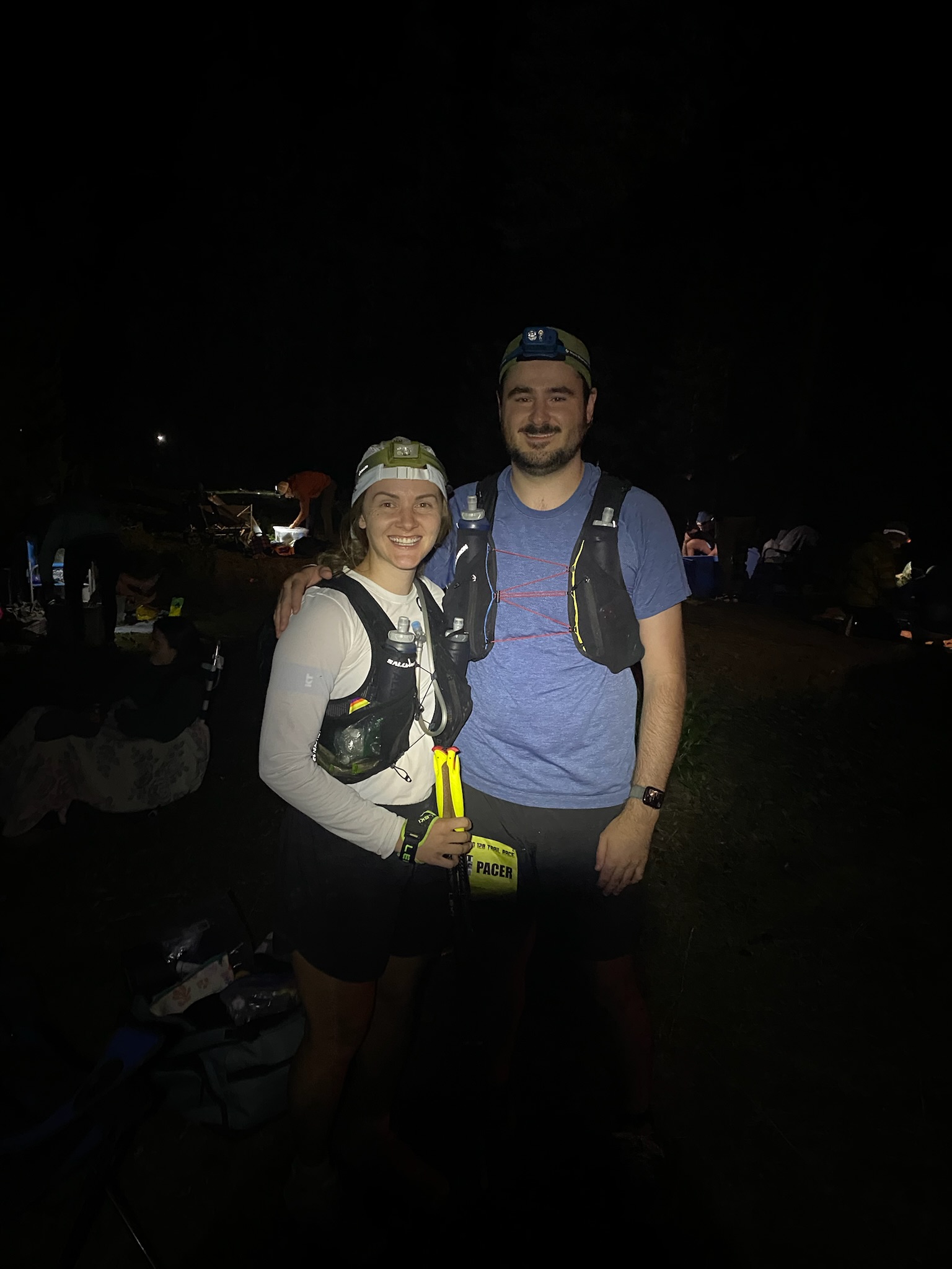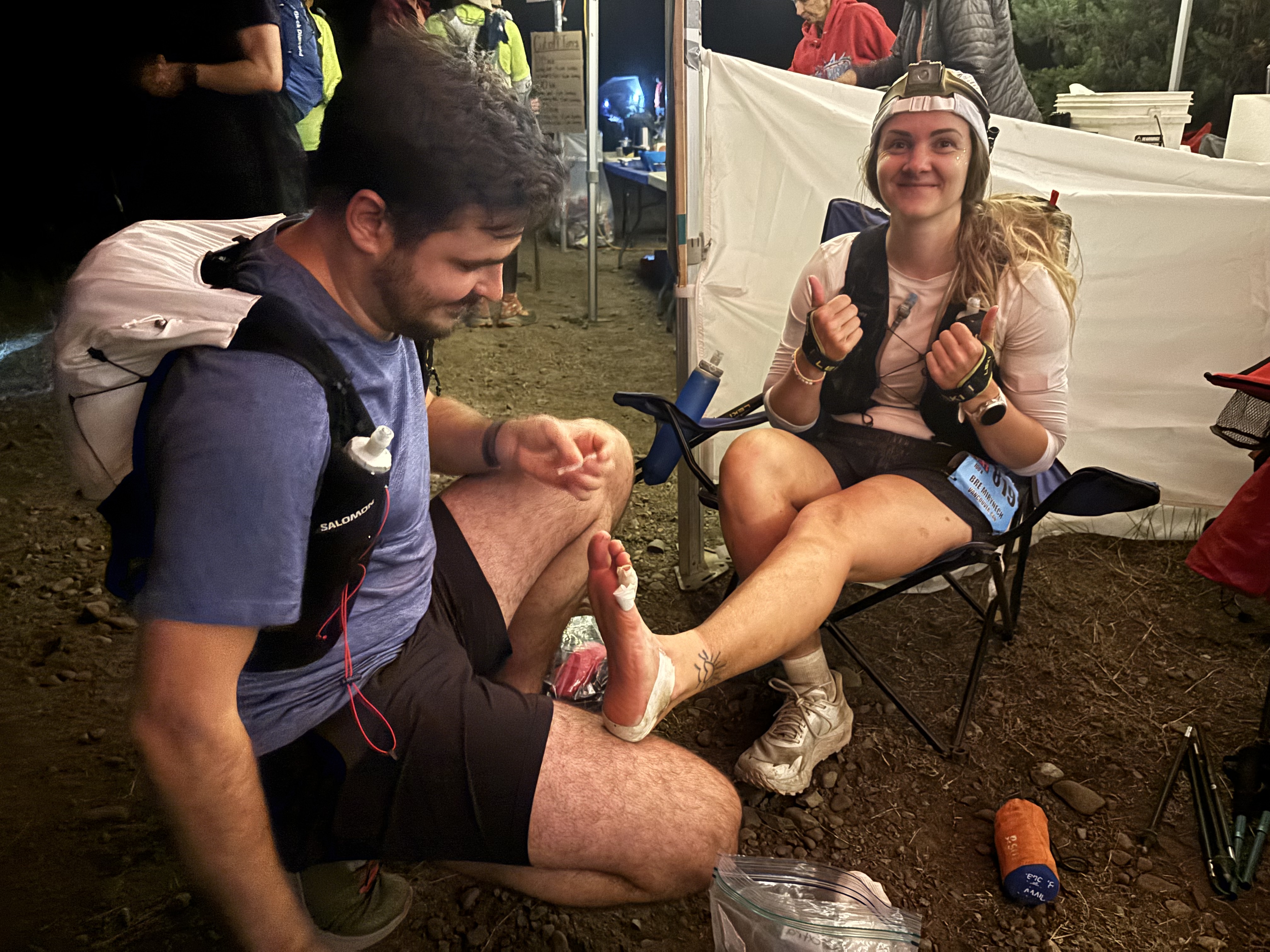 We made it to Blackwall (70km ish), reunited with the crew, ate more solid food, taped more toes, taped more chafe, and then we picked up our reflective vests and headed into the sunset for the section down the road. From Blackwall to the next aid station at Windy Joe’s is about 10-11km, with most of it being downhill on the road (hence the mandatory reflective vests). We set out at a steady pace on the downhill, and I was really proud of us because I felt like we really nailed a solid, consistent pace without completely blowing up the legs on the descent. In hindsight this was so smart as even with good pacing, the legs really started to feel this descent after a while. I had a brief bladder panic (if you know about my Death race story last year then you know what I mean), but turns out I was just incredibly hydrated and had to pee a bunch. Eventually we made it to Windy Joe’s, and while I was really hoping not to stop at that aid station, I did have to stop to deal with taping some more toes. I also grabbed some more noodles and food, and then Rachel and I continued on for the last section we would run together. It was completely dark by now, and this section was pretty rambly until we reached the last aid station- Strawberry Flats.