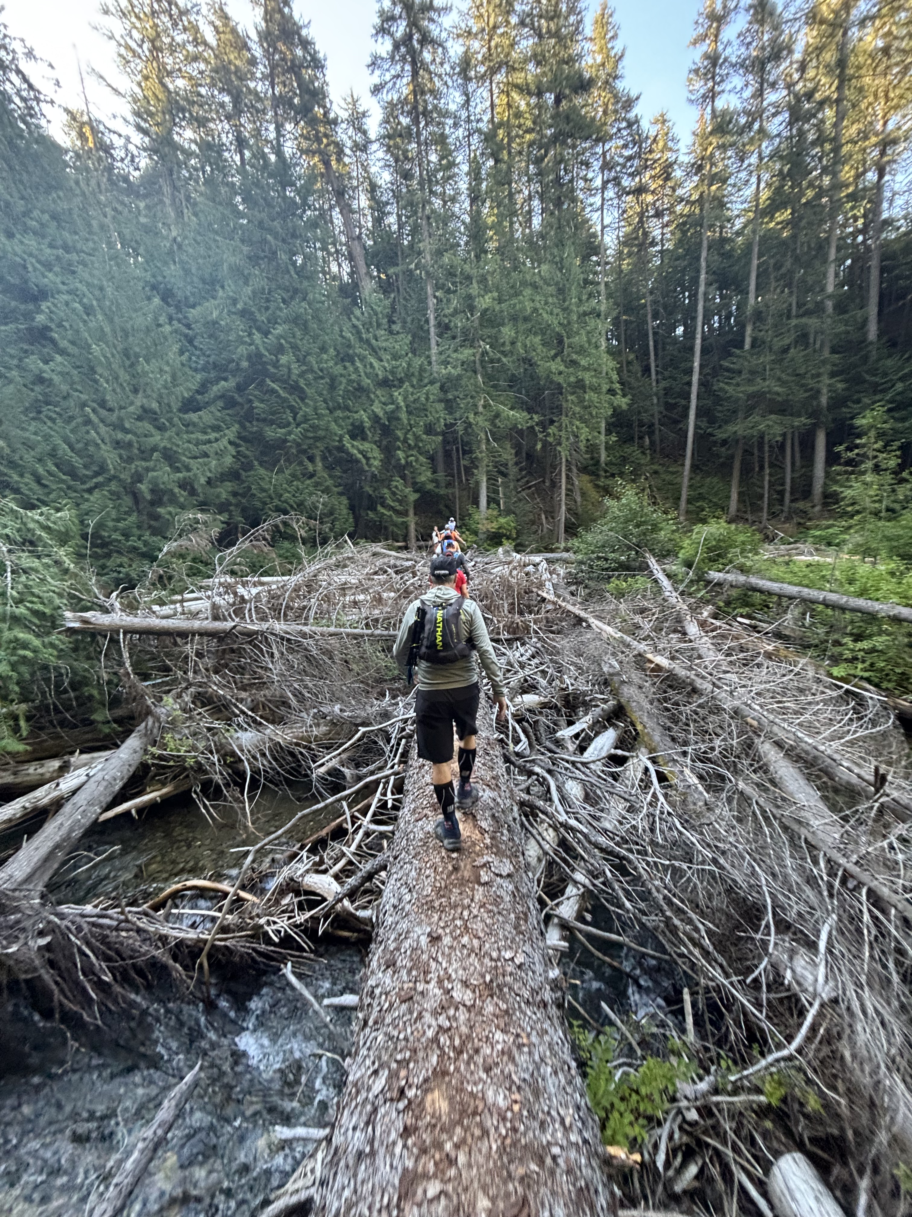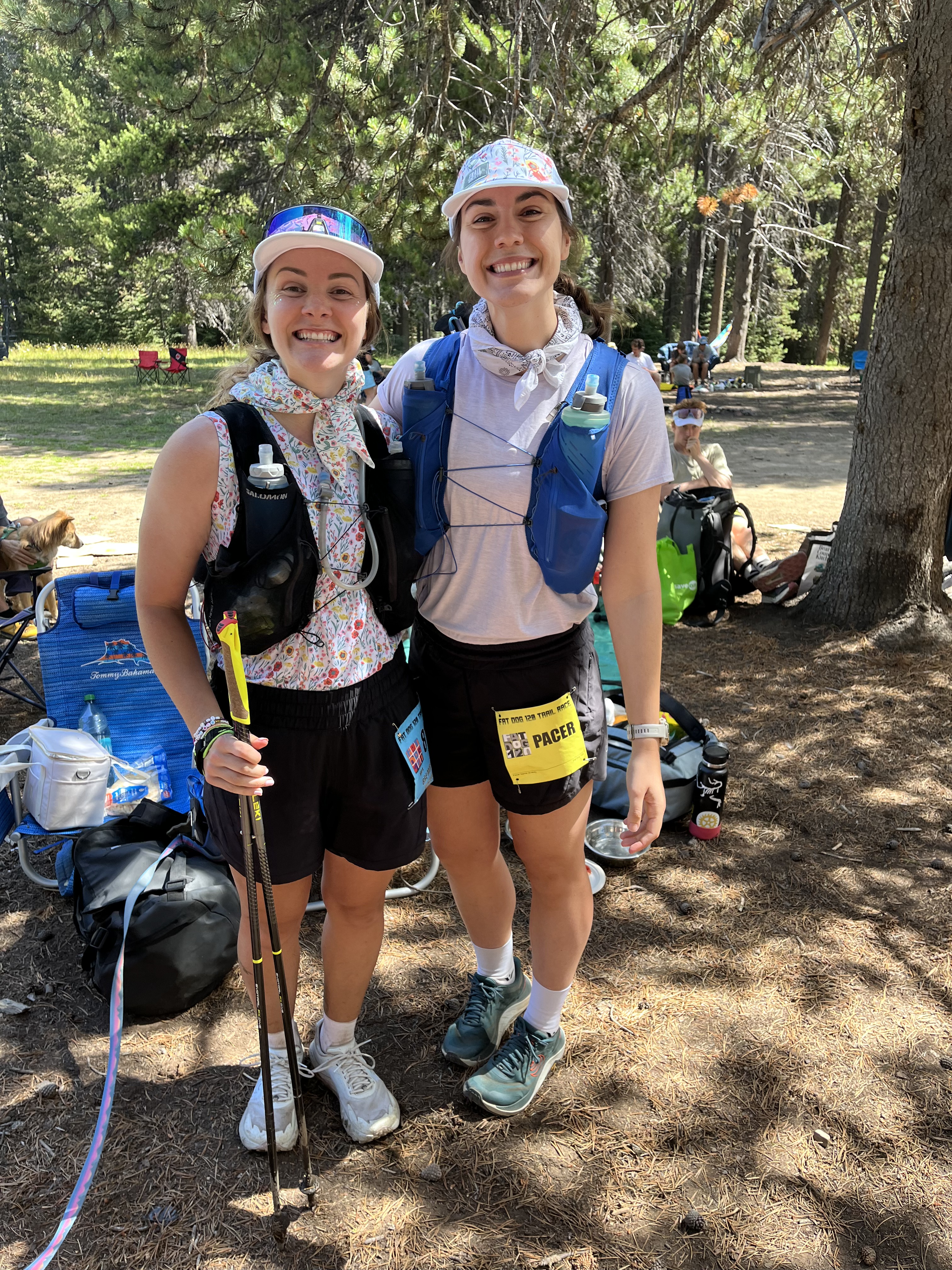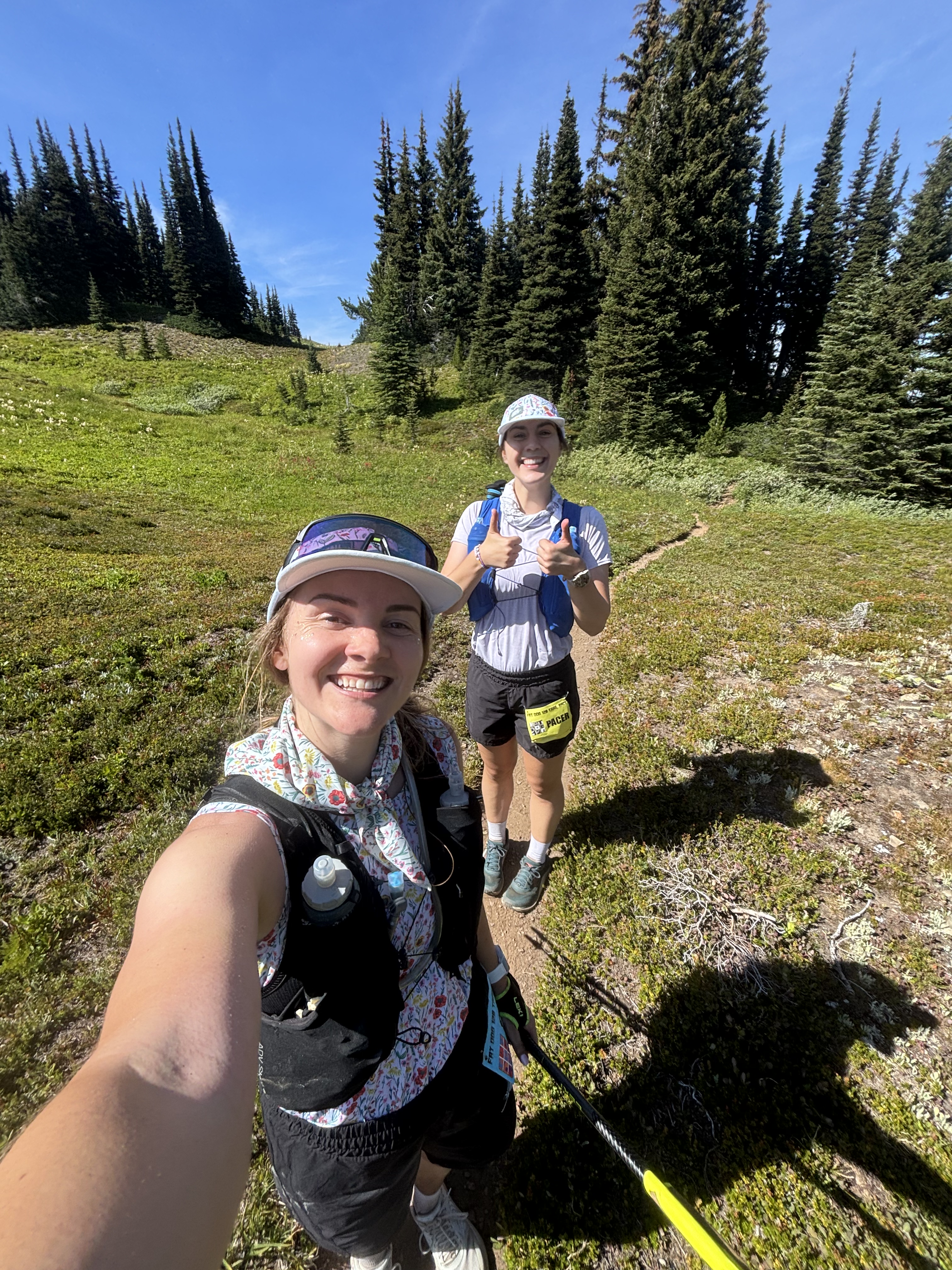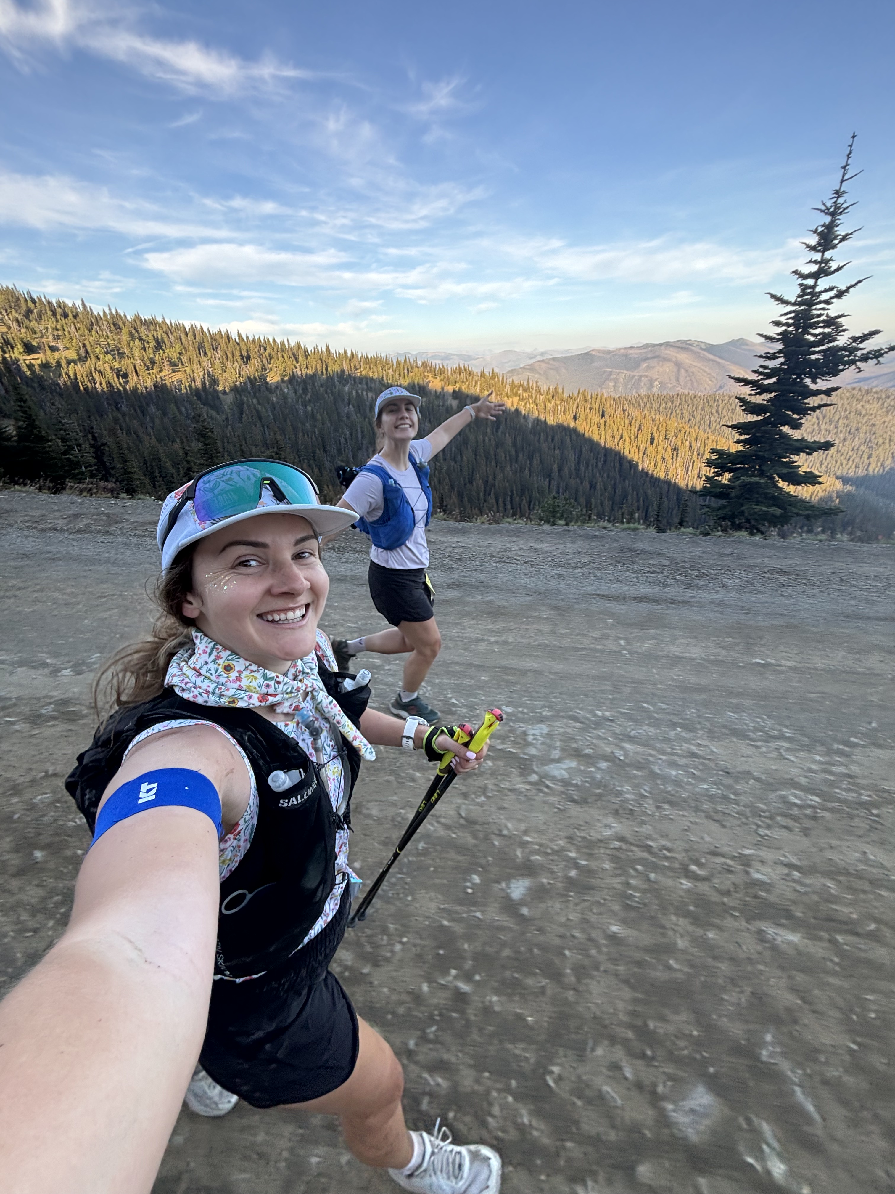I made it to Hope Pass (30km in) and met my crew. I also saw Sarah’s partner Cole as I was coming in and was able to relay what information I had, so I felt mildly better knowing that they at least knew what happened. I can’t tell you how excited I was to get to Hope Pass because at Fat Dog they let you pick up a pacer super early! So getting to Hope Pass meant that I was picking up Rachel, and with how the morning was going so far, I was really excited to have her energy, company, and support through the next section. At the aid station my crew (Danielle, Mack and Rachel) got my vest restocked, helped me tape up some chafe, and got me some SOLID FOOD- this was a huge deal for me and my stomach guys!!! I can rarely stomach soldi food during a race anymore. Rachel was ready to go and so we headed back out for the next section to Blackwall (km 70) together. There are a few km of out and back to the Hope Pass aid station, and as we were heading back out we saw Sarah running in!!! It felt like a huge cloud lifted off me to know that she had made it to her crew- whether or not she headed back out from there I wasn’t sure, but I felt so much better knowing she was with them.