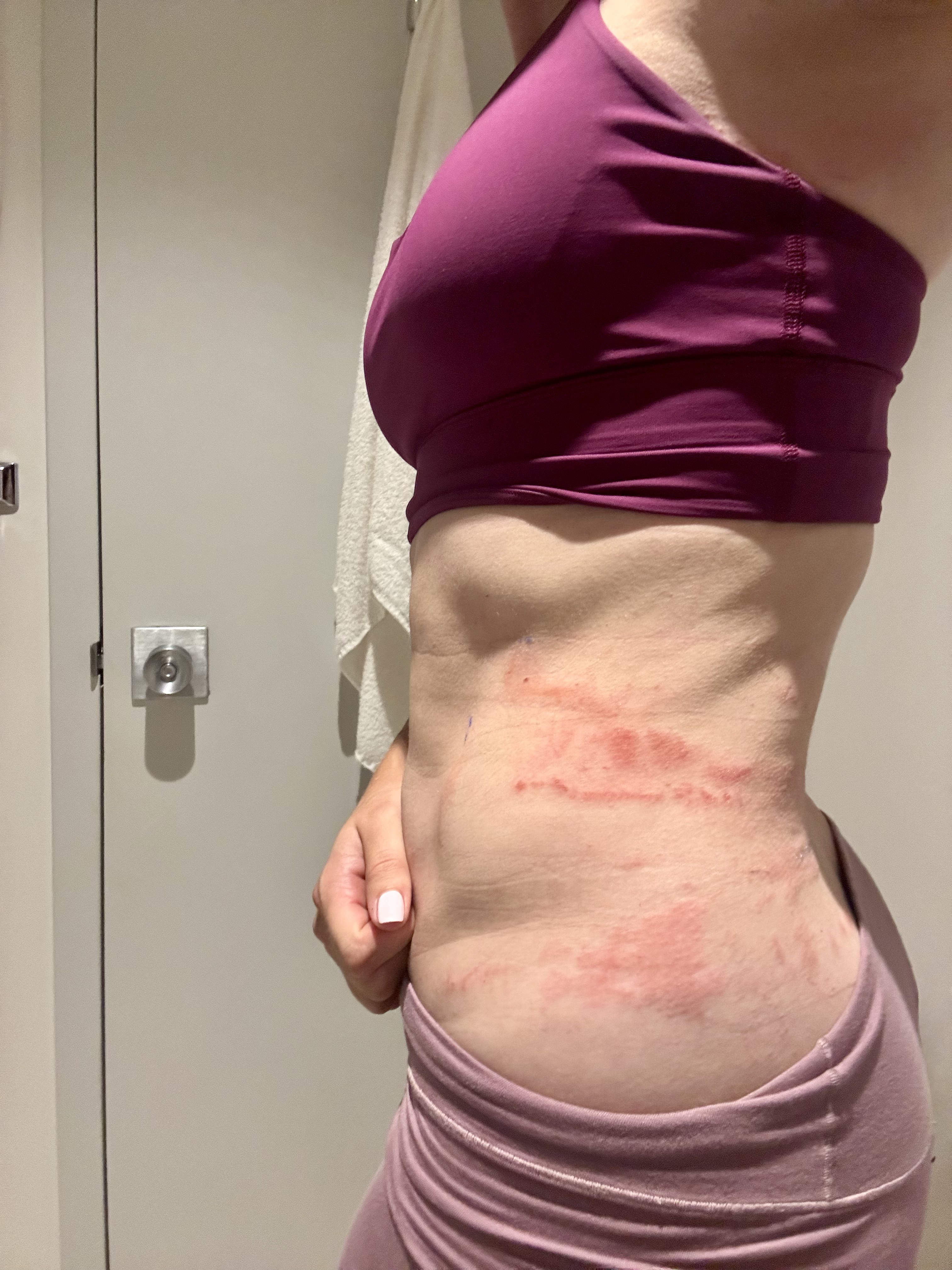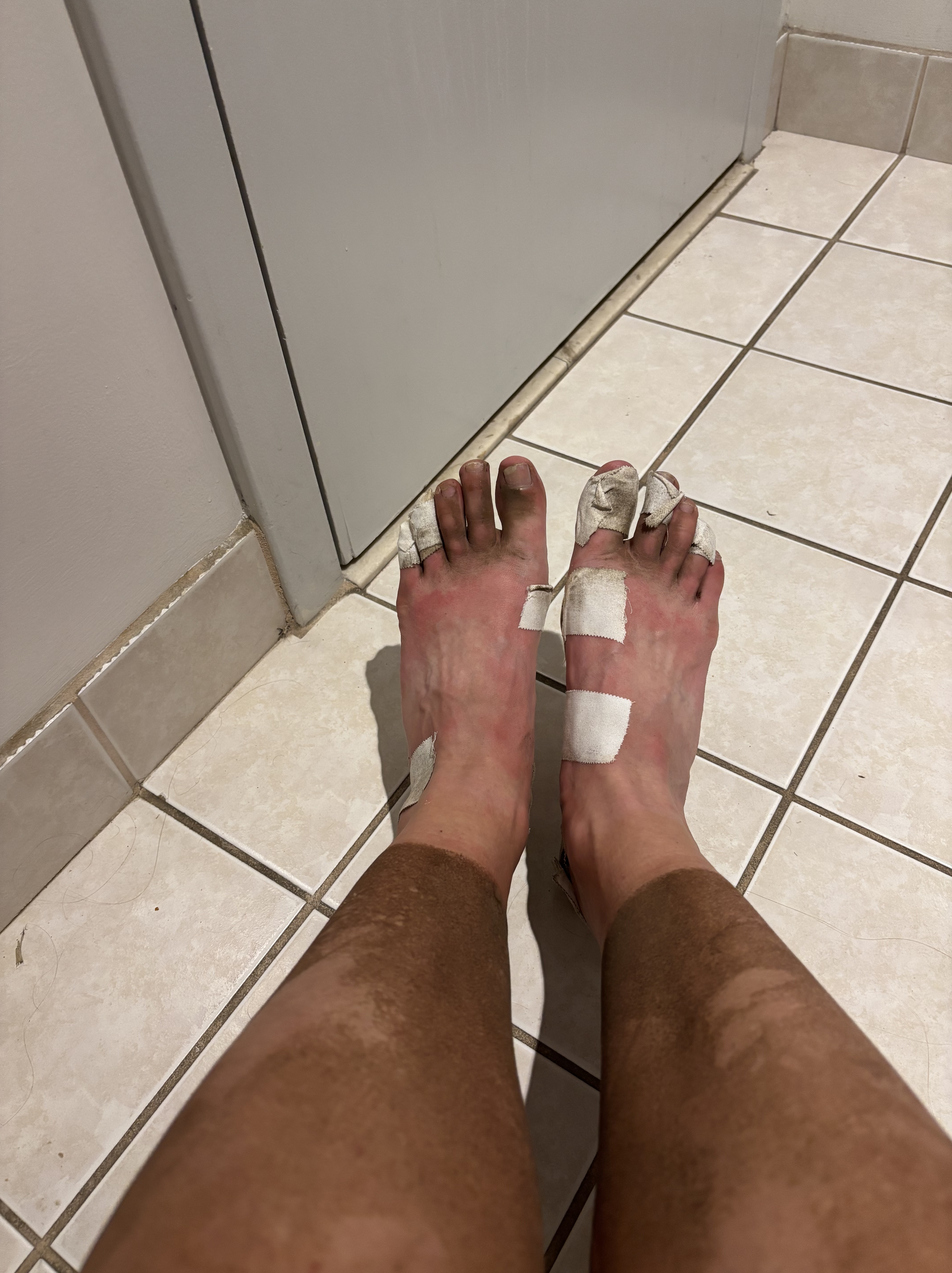 Little did I know… next came the hard part. We got back to the hotel and while all the tape throughout the day had been a lifesaver for my feet and chafe, it was time to rip it off. Let me set the scene for you. It was around 5:00am after running for nearly 21 hours, and I was sitting on the bathroom floor while Mack was trying his best to help me remove the tape because I couldn’t. The first piece ripped off and I felt like I was going to vomit, but eventually, somehow, we got it all off. I refused to shower because my chafe was so raw and painful, and so I used a giant pack of baby wipes and scrubbed myself head to toe as best I could. Around maybe 6:00am I finally got into bed and slept for all of 1.5 hours before waking up as everyone else in the room was slowly getting up. I immediately checked the results page to see if Sarah had finished, as I still had no idea what happened with her and her ankle after seeing her come into the aid station back at 30km, and after refreshing it a few times we saw that she had just finished! We celebrated in our room because every single one of us showed up to Fat Dog to chase our big goals, and we all had our days.